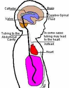 It consists of a system of tubes with a valve to control the rate of drainage and prevent back-flow.  It is inserted  surgically so that the upper end is in a ventricle of the brain and the lower end leads into the abdomen (ventriculo-peritoneal or V.P. Shunt).